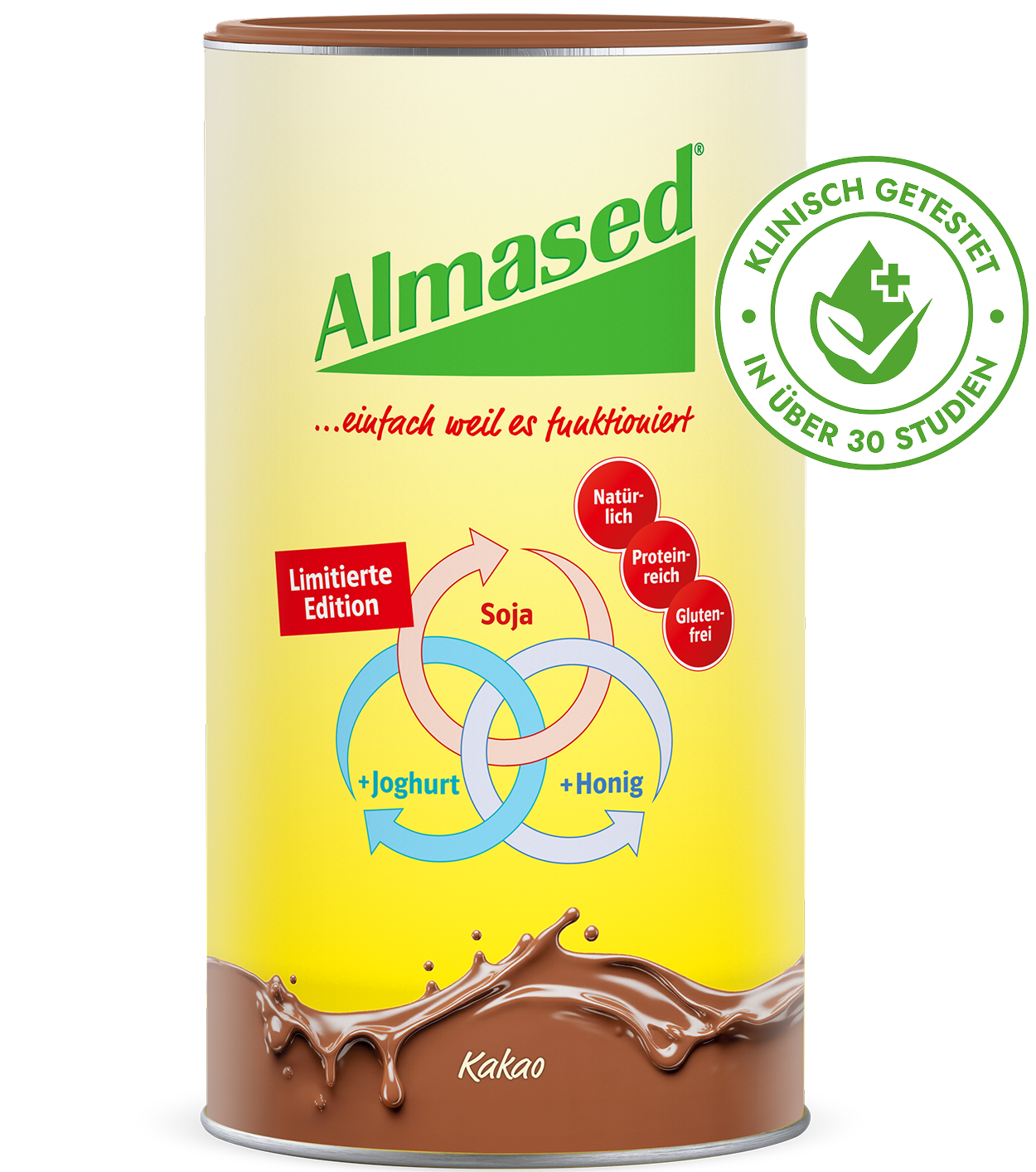 Almased Kakao basiert auf der besonderen Almased-Rezeptur. Der Stoffwechsel-Mix aus hochwertigem, fermentiertem Sojaprotein, wertvollem Magermilch-Joghurt und enzymreichem Honig entsteht durch ein einzigartiges, schonendes Herstellungsverfahren. Das sorgt dafür, dass aktive Honigenzyme erhalten bleiben und bioaktive Peptide gebildet werden. So entsteht eine natürliche, hochfunktionale Mischung, die es so nur bei Almased gibt. Der echte Kakao sorgt für einen ausgewogen schokoladigen Geschmack.