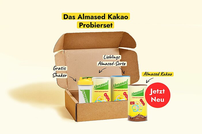 Neugierig auf unsere neue Almased Sorte? Dann ist jetzt der ideale Moment. Im Probierset erhalten Sie eine Dose Almased Kakao und zwei weitere Dosen Ihrer Wahl im Bundle. Das Probierpaket bietet alles, damit Ihr Einstieg lecker und abwechslungsreich wird.